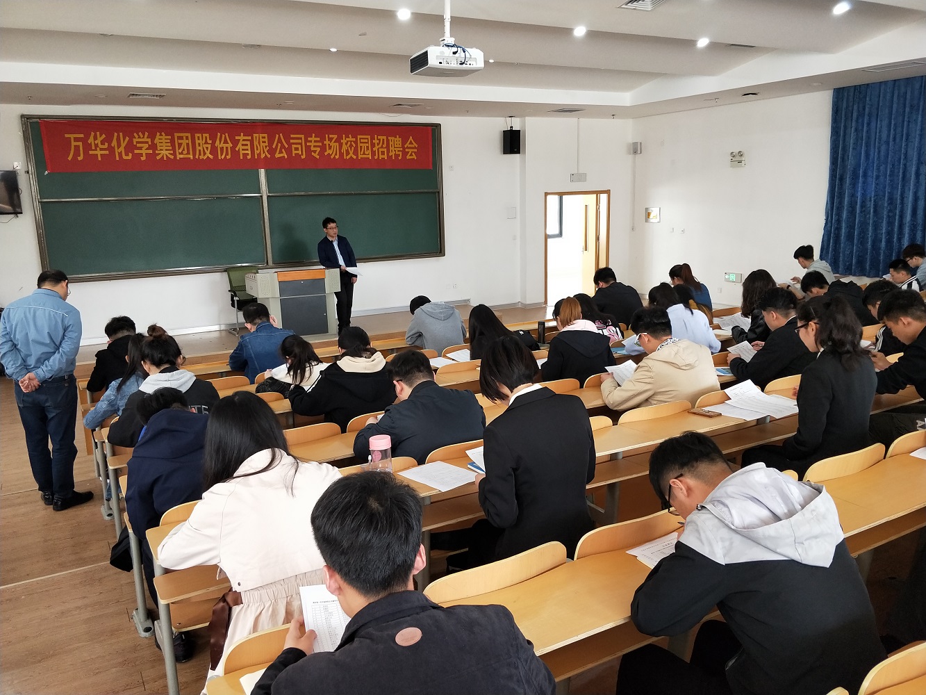 招聘宣讲会上,万华化学人力资源招聘经理介绍了公司的发展历史、企业文化、员工的工资和福利待遇、工作岗位、培养成长体系等情况。对于学生关注的个人培训成长体系,万华化学招聘经理作了特别介绍,万华化学始终将人才作为公司的第一核心战略资源来培养,实行有万华特色的“双导师制”,为每位员工提供职业与专业双导师。职业导师与员工没有业务关系,帮助员工进行职业规划;专业导师是同岗位上的前辈,帮助员工尽快熟悉工作。万华还为员工提供通用课程、岗位技能课程和管理与领导力课程,方便员工在工作之余进行“自我充电”,完善职业技能,不断发掘自身潜能。此外,定期的“高管咖啡时间”活动为普通员工和企业高管提供面对面的交流机会,高管了解员工工作和学习上的需求,并据此进一步完善人才发展机制。到场的学生被万华的发展理念、人才机制、薪资待遇、工作环境等深深吸引,表现出极大的兴趣。万华化学人力资源总监赵继德还与学生进行了现场交流,回答了学生们关注的几个问题,欢迎山东化工职业学院学子加入万华化学,实现企业和个人的共同发展。宣讲结束后,万华化学对学生以笔试的形式进行了专业素养和心理测试。