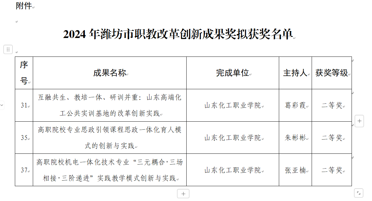 12月4日,潍坊市教育局发布了《关于2024年潍坊市职业教育改革创新成果奖拟获奖名单的公示》。我校3项教学成果获得二等奖,分别是葛彩霞主持的《互融共生、教培一体、研训并重:山东高端化工公共实训基地的改革创新实践》、朱彬彬主持的《高职院校专业思政引领课程思政一体化育人模式的创新与实践》、张亚楠主持的《高职院校机电一体化技术专业“三元耦合·三场相接·三阶递进”实践教学模式创新与实践》。