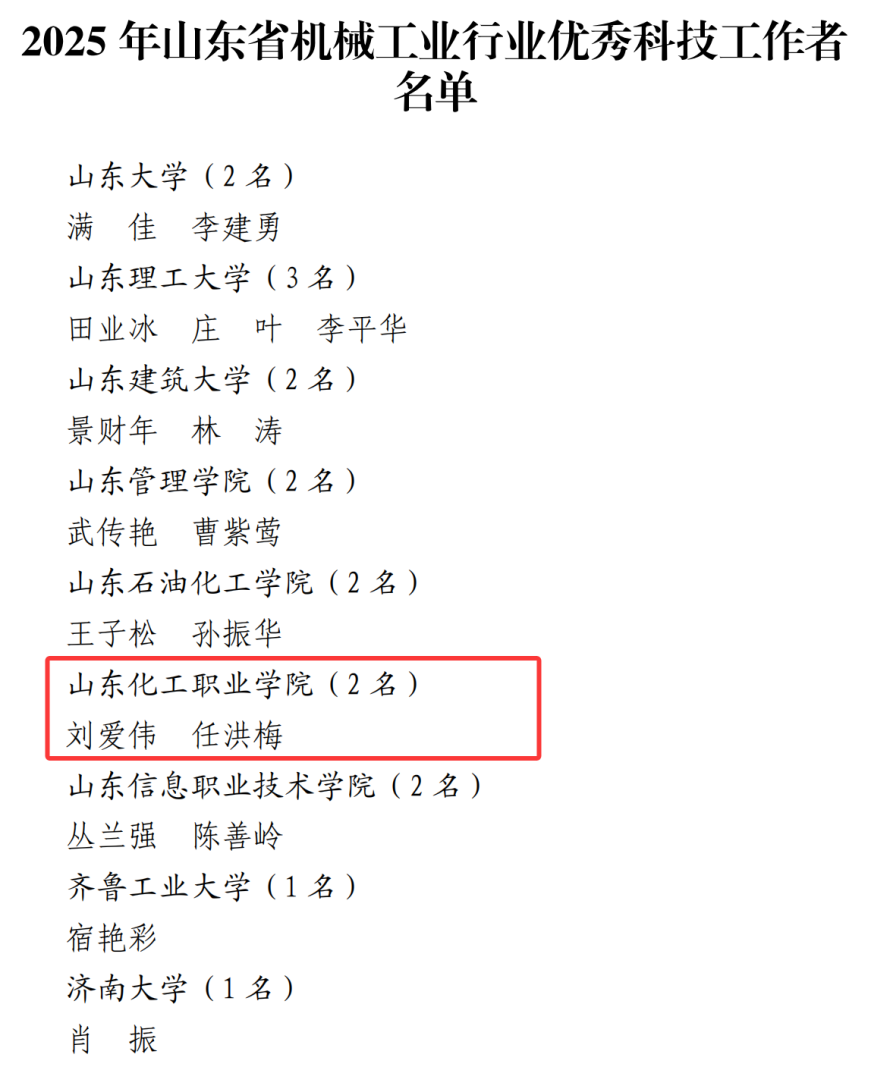 近日,山东省机械工业协会传来喜讯,在第七届山东省大学生装备制造业创新大赛表彰评选中,我校教师刘爱伟、任洪梅凭借在指导学生创新实践、推动行业科技人才培养方面的突出贡献,被授予“山东省机械工业行业优秀科技工作者”荣誉称号。