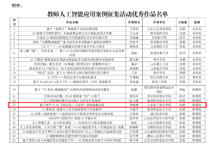 近日,山东省电化教育馆公布了2025年山东省教师人工智能应用案例征集活动评选结果,我校教师李晓琳的“基于国产AI的《网页设计与制作》课程助教实践”案例成功入选。