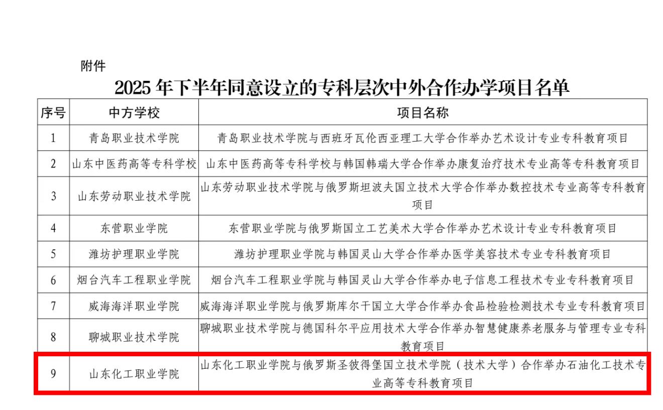 近日,山东省教育厅发布《关于公布2025年下半年专科层次中外合作办学项目的通知》(鲁教外函〔2025〕64号),我校与俄罗斯圣彼得堡国立技术学院(技术大学)合作举办石油化工技术专业高等专科项目成功获批,这是我校首个中外合作办学项目,正式纳入山东省普通高校夏季高考普通类常规批次中外合作办学招生类别,将于2026年开启计划内统招招生。