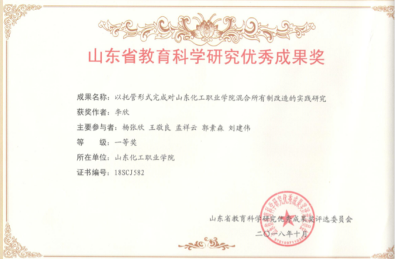 2018年9月28日,山东省教育科学研究优秀成果奖评选委员会下发《关于2018年山东省教育科学研究优秀成果奖评选结果的通知》,我院李欣副院长主持完成的《以托管形式完成对山东化工职业学院混合所有制改造的实践研究》课题喜获一等奖。