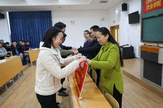 最后进入颁奖环节,获得奖学金的同学们上前领奖。刘书瑞获得一等奖学金1500元;焉巧虎、杨帅、王者陈一分别获得二等奖学金1000元;王修辉、段明月 、孙明磊 、于万欣 、于建涛 、路开虎 、王英豪 、杜文静分别获得三等奖学金500元。