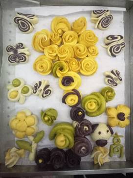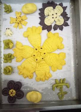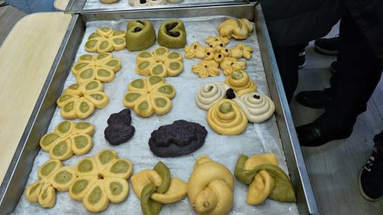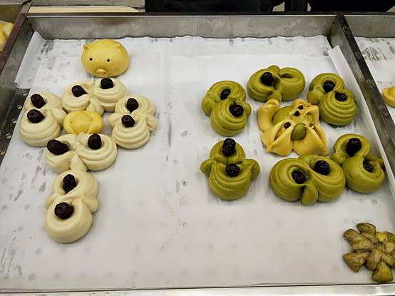 和面、揉面、切面、捏面,大家各司其职,有质有序。教书育人的老师们原来在厨艺上也是行家里手,一个个面团在心灵手巧的老师们手下变的乖巧无比,有的面团被搓成条,有的被揉成块,再辅以材料的点缀,短短时间里,一个面品就做成功了。大家发挥自己的奇思妙想,形态各异,有做成小动物的,有做成花卷的,有做成元宝的……,颜色也色彩不一,红、粉、绿、黄等颜色纷纷登场,炫耀着自己的身姿,展示着主人的手艺。