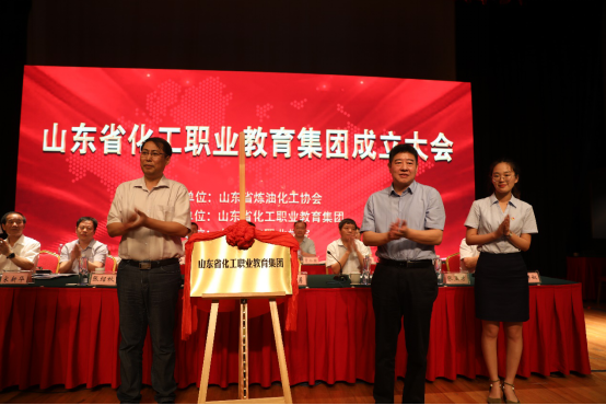 山东省教育厅职业教育处二级调研员孟令君(左一)、山东省炼油化工协会综合管理部主任杜勇(右二)为山东省化工职业教育集团成立揭牌