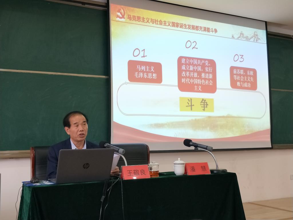 王敬良以《发扬斗争精神,增强斗争本领,推动学校高质量发展》为题,结合学院发展,主要讲解了三部分内容。第一是马克思主义与社会主义国家诞生发展都充满着斗争;第二是新时代实现党的任务,必须发扬斗争精神,增强斗争本领;第三是要在维护学院高质量发展中敢于斗争,善于斗争。结合习近平总书记在“不忘初心、牢记使命”主题教育工作会议上的重要精神,强调党员必须增强“四个意识”,坚定“四个自信”,坚定“两个维护”,坚定斗争意志;在严峻形势和斗争任务摆在面前时,骨头要硬,敢于出击,敢战能胜。