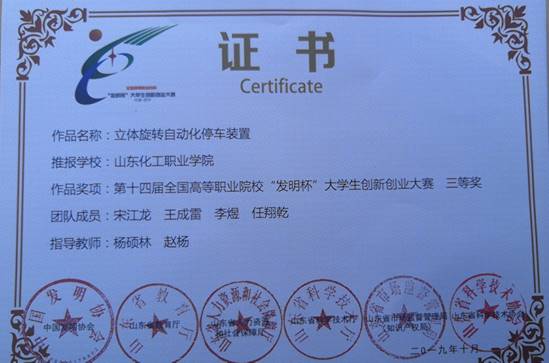 10月26日,第十四届全国高等职业院校“发明杯”大学生创新创业大赛(决赛)在山东理工职业学院隆重举行,来自全国20个省市132所参赛院校的1600名大学生选手,涉及8000余件发明作品汇聚一堂,同台竞技,最终我院机电工程系宋江龙等四位学生在教师杨硕林老师与赵杨老师指导下的设计发明作品-“立体旋转自动化停车装置”斩获大赛三等奖。