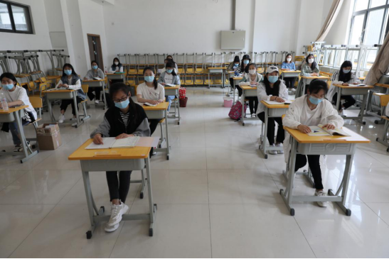 排队有序进入教学楼,单人单桌上课,保持一定距离。