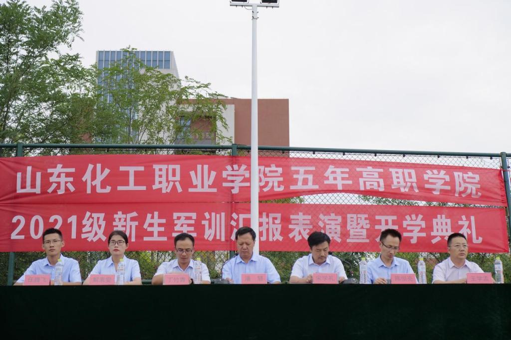 金秋送爽,意气轩昂。9月24日下午,五年高职学院2021级新生军训汇报表演暨开学典礼在学校足球场隆重举行。2021级新生们以昂扬向上的精神面貌接受检阅,宣告着为期半个月的军训生活正式收官。山东化工职业学院党委副书记潘慧、教务科研处副处长丁竹青、学生工作处副处长陈恒亮和五年高职学院领导班子以及2020级、2021级全体师生参加大会。大会由五年高职学院党支部书记、院长宋学礼主持。