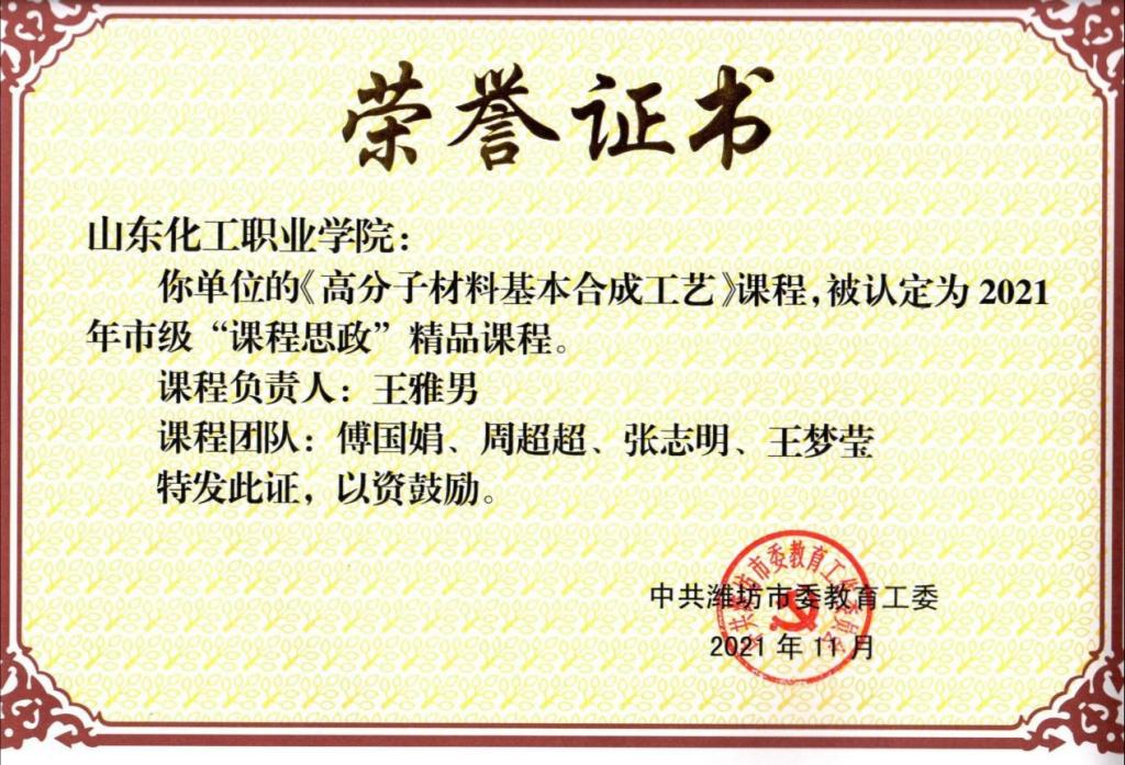 根据《关于做好近期思政有关重点工作的通知》(潍教工委函〔2021〕2号)精神,经各学校评选推荐、潍坊市专家评审、结果公示等环节,确定了71门市级“课程思政”精品课程。其中,我校王欣老师负责的《化工原理》课程、王雅男老师负责的《高分子材料基本合成工艺》课程和张宝玲老师负责的《基础化学》课程成功被认定为市级“课程思政”精品课程。