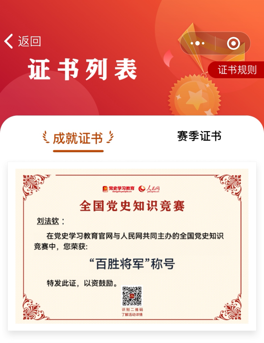 兴趣是学习最好的动力。谈到自己在“学习强国”上取得的优异成绩,刘老师首先归功于自己对于历史等人文社科的浓厚学习兴趣。“学习强国”上的理论、党史、文化、文艺、科学、法治知识为刘老师提供了丰富的学习资源,借助平台上丰富的学习资源和竞赛答题,丰富学习模式,提高了学习兴趣,更加热衷于学习,学习成绩自然名列前茅。2020年11月11日,刘老师在“学习强国”挑战答题创下1600道题全通关的记录。在党史学习教育网和人民网今年主办的党史学习教育知识竞赛中,刘法钦老师坚持学习和答题,成绩优异,荣获“最强大脑”、“百胜将军”“勤学不倦”和“知识达人”等称号。
