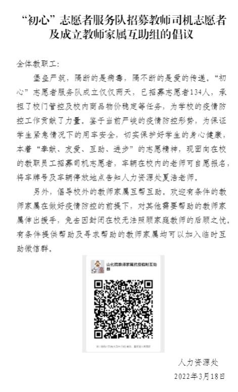 人力资源处向在校教职工招募司机志愿者,同时倡导校外的教师家属互帮互助和成立临时互助微信群,解决封校无法照顾家庭的教职工的后顾之忧。