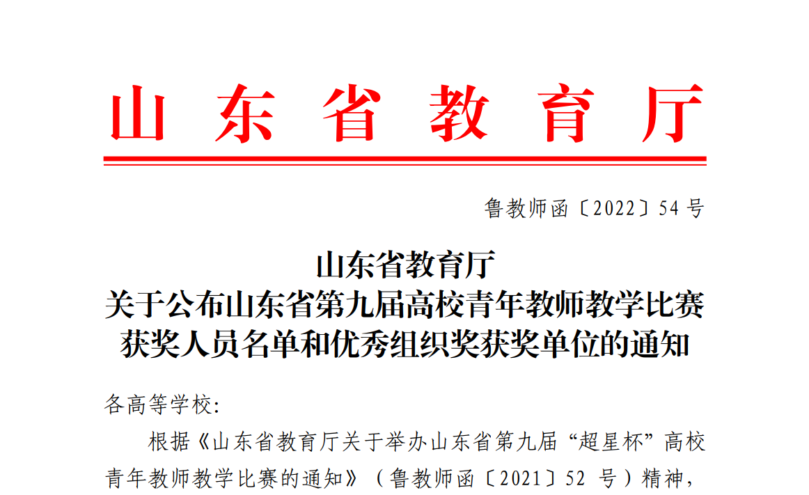 近日,山东省教育厅发布《关于公布山东省第九届高校青年教师教学比赛获奖人员名单和优秀组织奖获奖单位的通知》,我校齐甜甜、颜永全两位教师均荣获比赛三等奖。