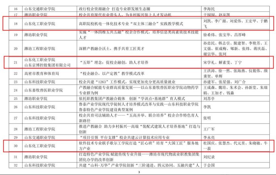 2022年4月,潍坊市教育局印发《关于征集产教融合校企合作典型案例的通知》,面向社会公开征集产教融合、校企合作典型案例。潍坊市产教融合研究院受潍坊市教育局委托组织评审专家对提报的案例进行了严格认真的审评,共遴选出50项典型案例,我校《高职院校机电一体化技术专业“双主体三融合”实践教学模式》《“五即”理念:促校企融创,助人才培养》《软件技术专业联手歌尔工学院打造“匠心班”培育“大国工匠”服务地方产业》共3项典型案例入选潍坊市2022年产教融合校企合作典型案例。