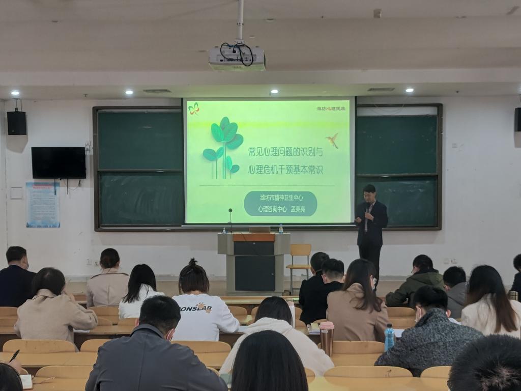 学生工作处全体人员、基础教学部分管领导及心理教研部教师、各二级学院分管学生工作的党支部书记或副书记及全体辅导员、班主任共60余人参加培训活动。培训活动邀请了潍坊市精神卫生中心专家孟亮亮、大学园派出所民警张勇就相关环节组织授课、答疑。