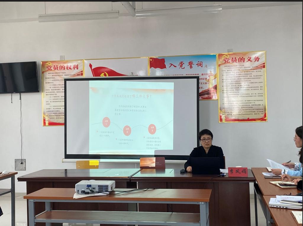 李处长结合学校发展历程及未来发展方向,从党的二十大主题是什么、学校经历的三件大事、如何推进实践基础上的理论创新、如何追求学校的高质量发展等方面,传达了学校的会议精神和工作要求,强调今后要把党的二十大精神贯彻落实到教育改革发展各方面、全过程,做到学深、悟透、做实,确保党的二十大深入人心,二是全体教职工要在政治、思想、行动上始终与党中央保持高度一致,立足岗位,明确责任,勇于担当,切实做到履职尽责。
