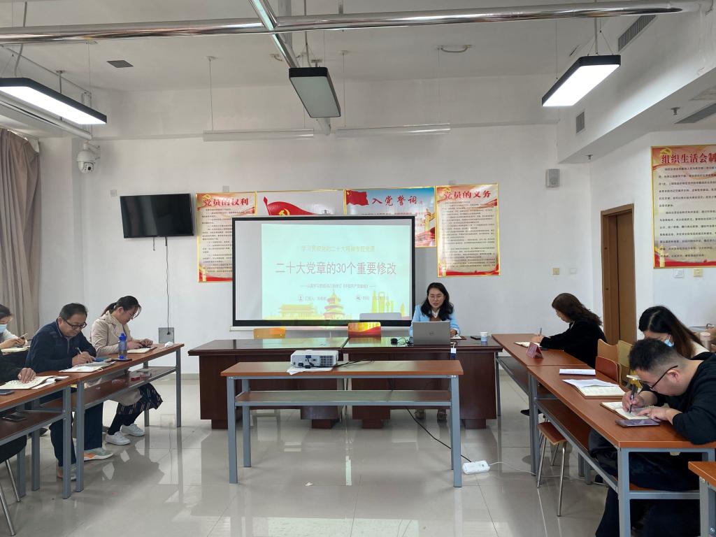 管理工程学院党总支书记朱彬彬带头领学二十大新党章。党章,是党的根本大法,是全党必须遵守的行为规范。朱彬彬书记用通俗易懂的语言讲述了党章中修改的部分,她强调,作为党员要牢固树立党章意识,带头尊崇、学习、遵守、践行、维护党章,把党章作为加强党性修养的根本标准,切实把学党章落实到行动中。