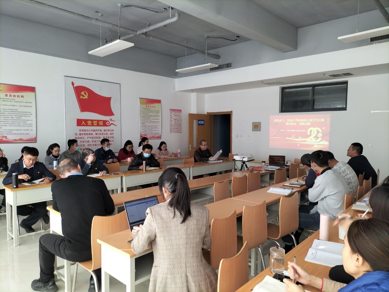 11月17日,基础教学部党支部刘建伟同志以“团结奋斗,推动中华民族伟大复兴号巨轮乘风破浪扬帆远航”为题,在党员和入党积极分子中开展学习,宣传贯彻党的二十大精神,凝聚团结奋斗力量。