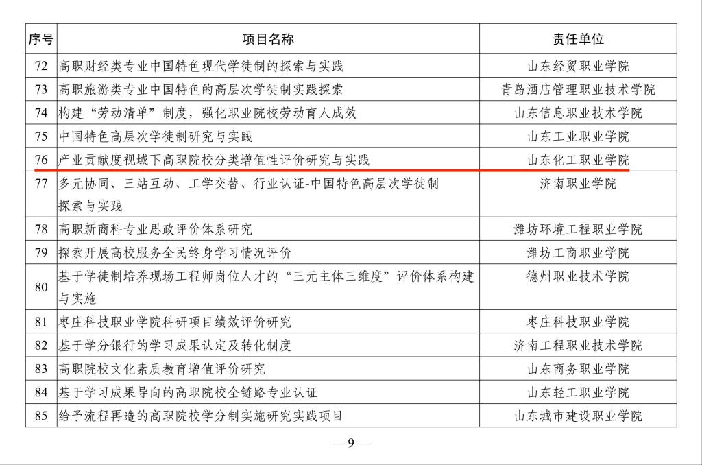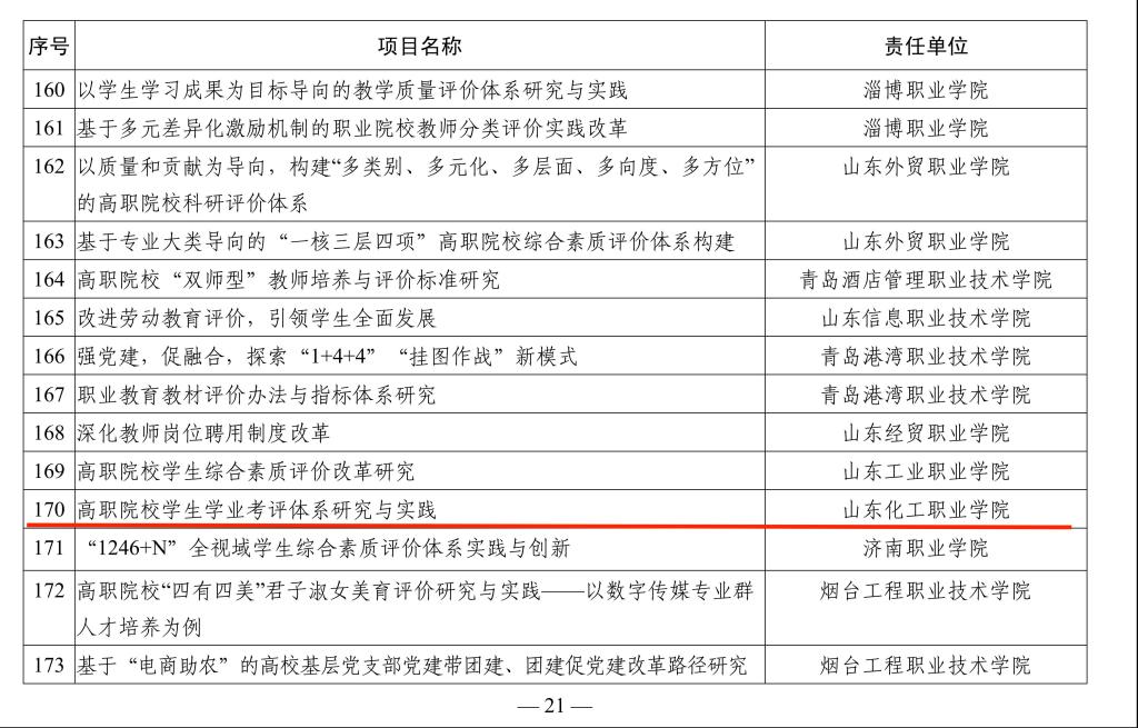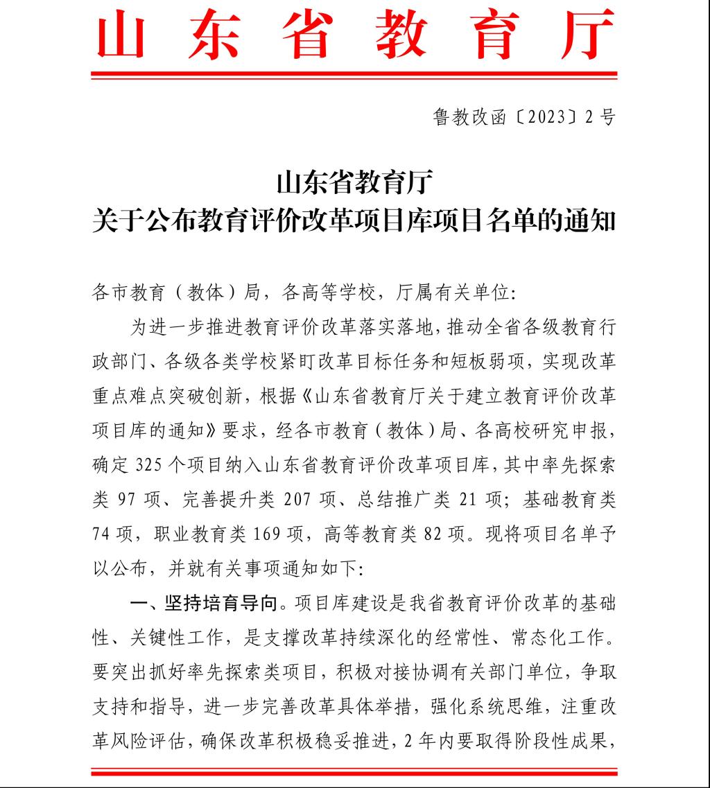 近日,山东省教育厅发布了《关于公布教育评价改革项目库项目名单的通知》,确定325个项目纳入山东省教育评价改革项目库,我校2个项目成功入选:分别是葛彩霞老师主持的《产业贡献度视域下高职院校分类增值性评价研究与实践》(率先探索类)和郑艳玲老师主持的《高职院校学生学业考评体系研究与实践》(完善提升类)。