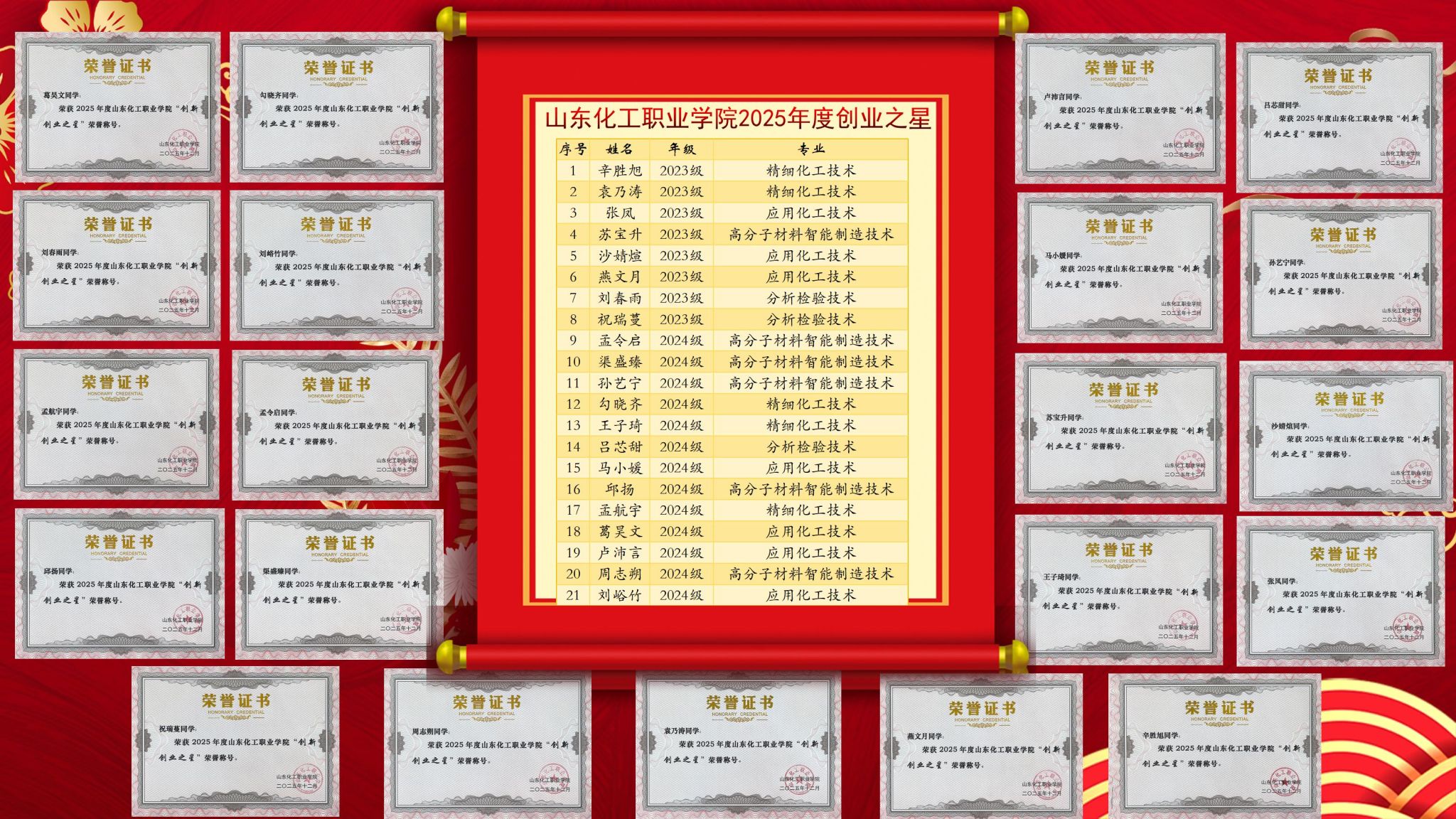 为进一步激发学生的创新创业热情,树立先进典型,营造良好的校园创新创业氛围,学校于12月18日组织开展了“创新创业之星”评选活动。化学工程学院高度重视、积极组织,学生踊跃参与申报,最终共有21名同学荣获“创新创业之星”称号。