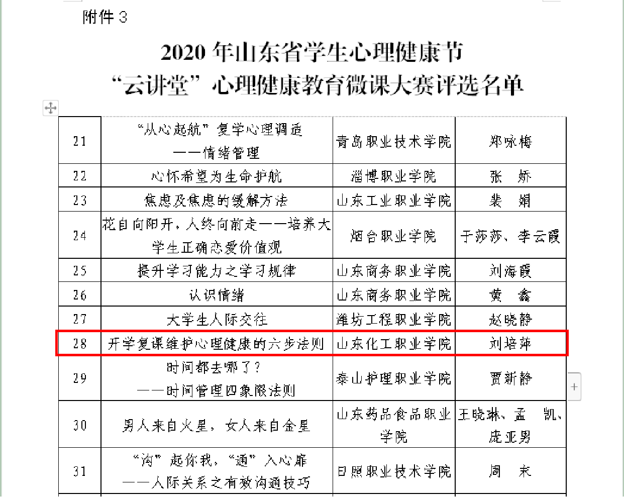 2.由刘培萍老师制作的“开学复课维护心理健康的六步法则”获得“云讲堂”心理健康教育微课大赛三等奖。