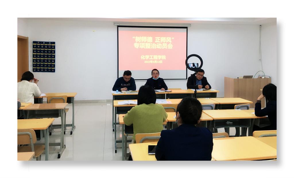 百年大计,教育为本;学校教育,师德为先。为深入贯彻落实省教育厅《关于开展山东省“树师德 正师风”专项整治活动的通知》,进一步加强和改进师德师风建设工作,结合新教师入职以来学院多次开展的师生民意调查讨论会结果,化学工程学院于2022年4月13日下午,通过线上、线下相结合方式,在2308组织召开了“树师德 正师风”专项整治动员会。会议由化学工程学院党总支副书记王恒磊同志主持,学院全体教职工参加。