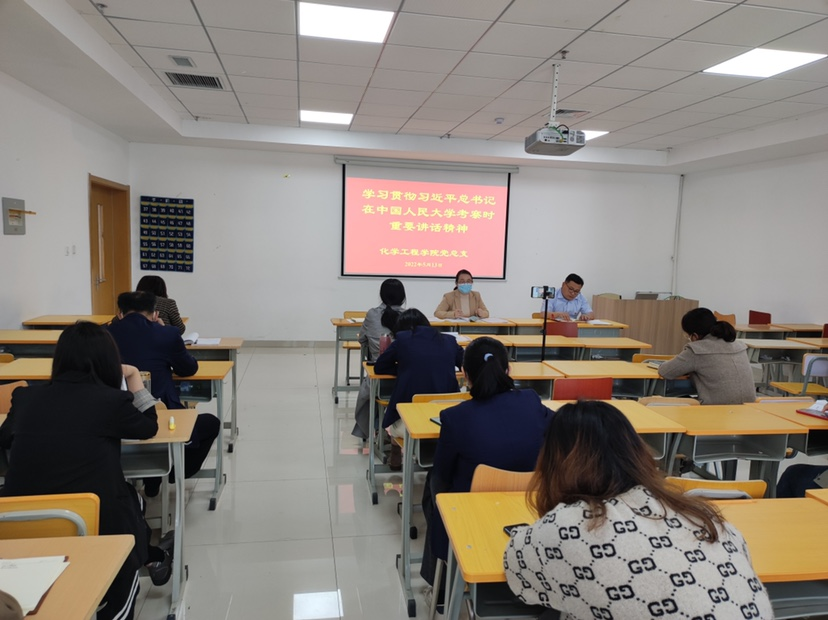 5月13日下午,化学工程学院全体教师及辅导员在2308教室采用线上线下的模式进行专题学习,内容为习近平总书记在中国人民大学考察时的重要讲话精神,由化学工程学院党总支副书记葛彩霞领学。葛彩霞同志带领全体教师首先观看了《新闻联播》播报的这次考察视频,随后全体教师及辅导员围绕习总书记的讲话展开深入交流和热烈的讨论。