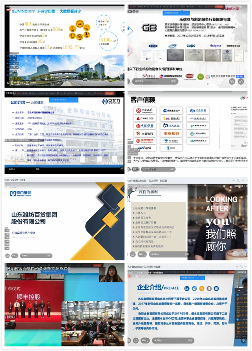 此次参会单位共安排8家,质量较往年有明显提升,其中国有企业一家,上市公司五家,顺丰、苏宁等五百强企业皆汇集线上,实时与参会学生互动交流。