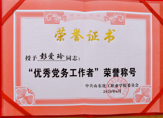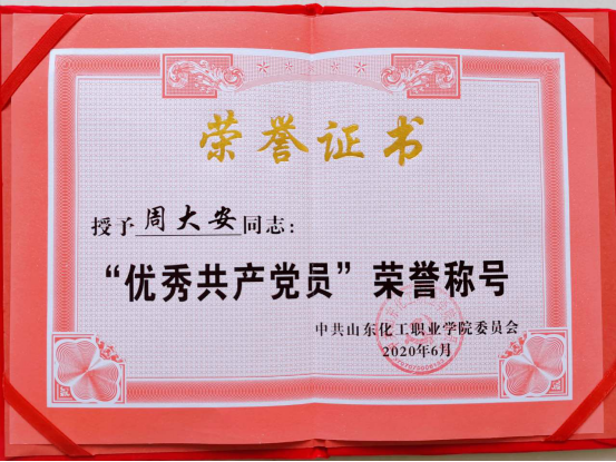 山东化工职业学院于2020年7月1日建党节当天,召开全校党员大会,表彰2020年度在疫情防控工作和“一先两优”及品牌创建优秀党支部评比中涌现出的先进集体和先进个人。在此次评比中,机电工程系党支部获得“先进党支部”荣誉称号,党支部书记彭爱玲获得“优秀党务工作者”荣誉称号,周大安和赵杨获得“优秀共产党员”荣誉称号。