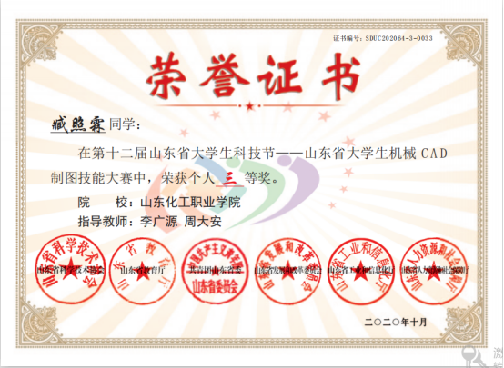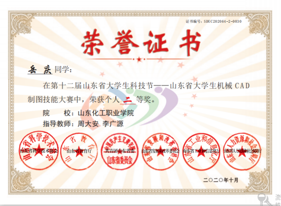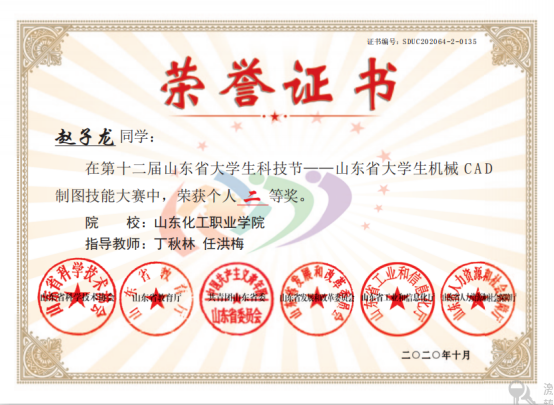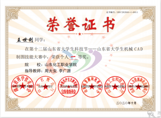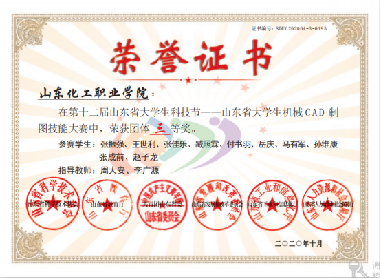 第十二届山东省大学生科技节-山东省大学生机械CAD制图技能大赛于10月24日如期举行,山东化工职业学院作为分赛场,圆满完成了比赛任务。经过激烈角逐,我院10名参赛选手(王世利、张佳乐、张振强、岳庆、付书羽、赵子龙、马有军、臧照霖、孙维康、张成前),在周大安和李广源两位指导教师的指导下,在决赛中喜获佳绩,共取得个人赛一等奖三项,二等奖四项,三等奖三项,团体赛三等奖一项,再创新高。
