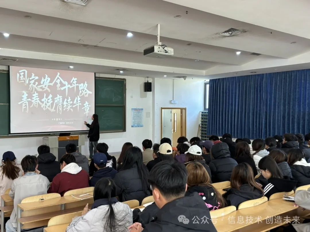 信息工程学院开展国家安全主题班会。班会上,学生一同观看维护国家安全的PPT,了解不同领域青年维护国家安全的先进事迹。并强调在日常生活中,要从自身做起,比如不随意在网络上传播敏感信息,不向不明身份人员透露涉及国家机密的内容等,将国家安全意识切实转化为实际行动。