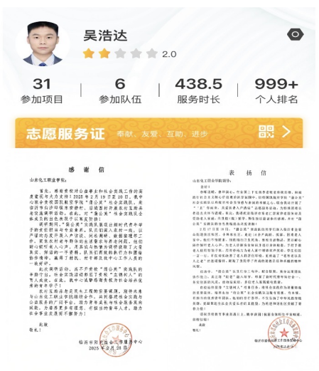 吴浩达连续两年参加青鸟计划,2025年2月,获评临沂市兰山区“十佳青鸟学子”荣誉称号;其创作日常工作Vlog视频被共青团临沂市兰山区委视频号投放,浏览量过万。作为项目组织者的他,还组织策划了2025年临沂市兰山区青年春节联欢晚会。