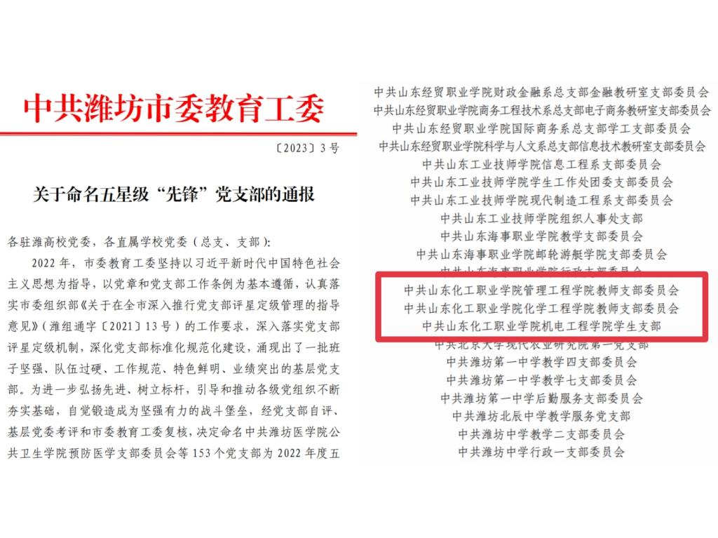 中共潍坊市委教育工委印发《关于命名五星级“先锋”党支部的通报》,我校管理工程学院教师党支部、化学工程学院教师党支部和机电工程学院学生党支部荣获2022 年度五星级“先锋”党支部荣誉称号。
