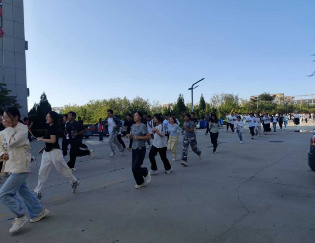 本次演练涵盖应急疏散、人员集结、安全宣讲等多个环节。随着警报声响起,信息工程学院全体在校生按照预定方案,在学生干部的组织下,学生以湿毛巾捂住口鼻、弯腰低姿的规范动作,迅速向操场集合,整个疏散过程紧张高效、秩序井然。