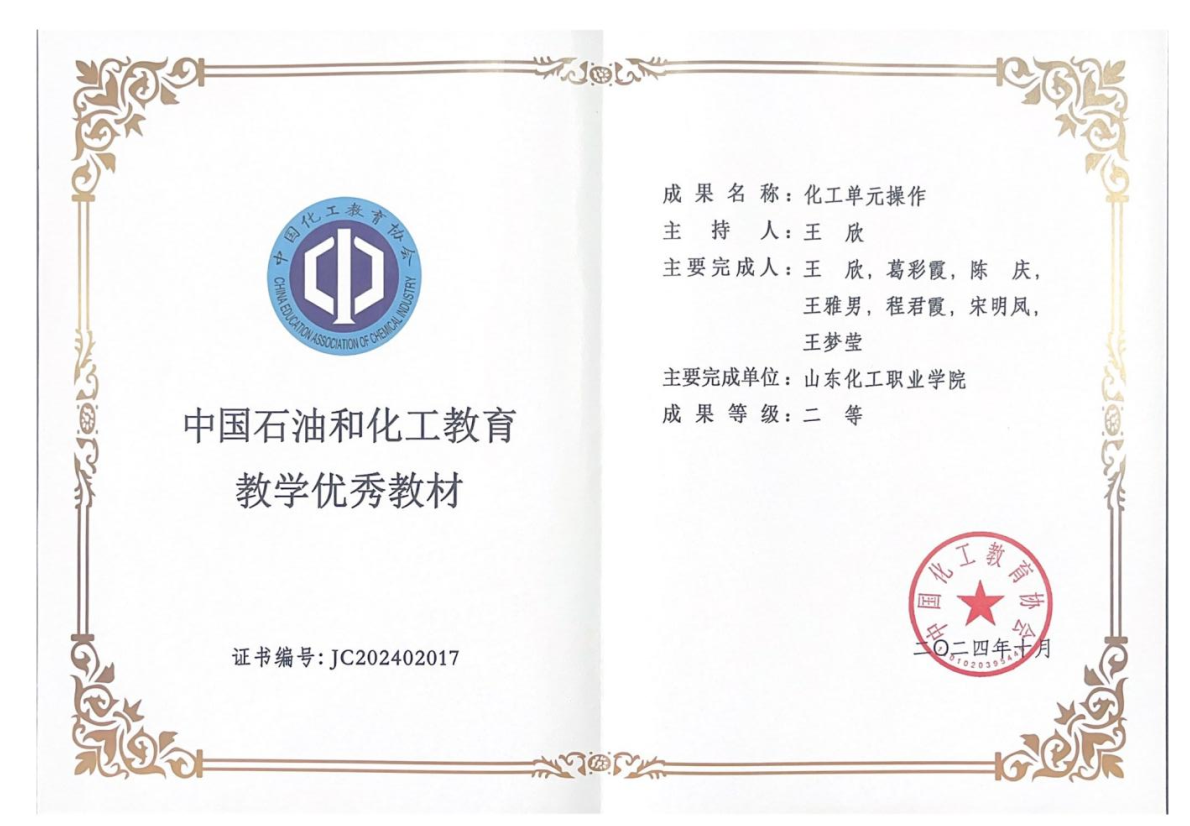 2. 《化工单元操作》教材获中国石油和化工教育教学优秀教材二等奖