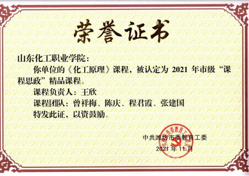 4.《化工原理》课程被认定为潍坊市课程思政精品课程