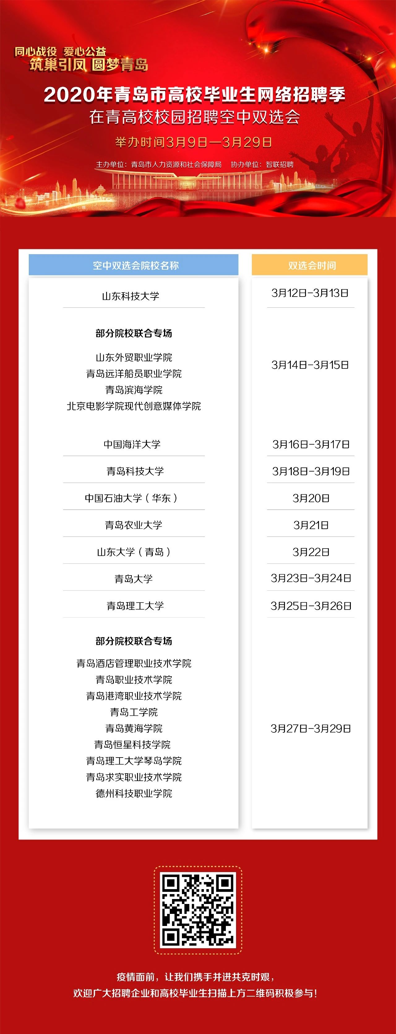 3月9日—3月29日期间,青岛市人力资源和社会保障局联合21所在青高校在青岛市高校毕业生网络招聘平台举办在青高校校园招聘空中双选会。