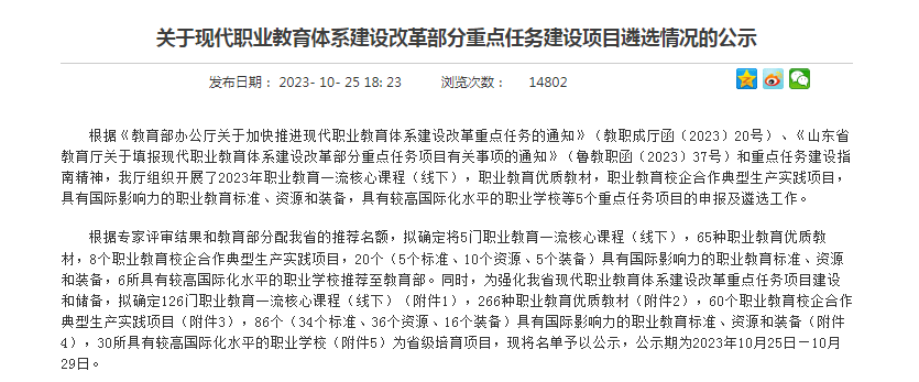 10月25日,山东省教育厅发布《关于现代职业教育体系建设改革部分重点任务建设项目遴选情况的公示》,我校课程团队开发的《视觉营销设计》课程被认定为2023 年职业教育一流核心课程培育项目(线下)。