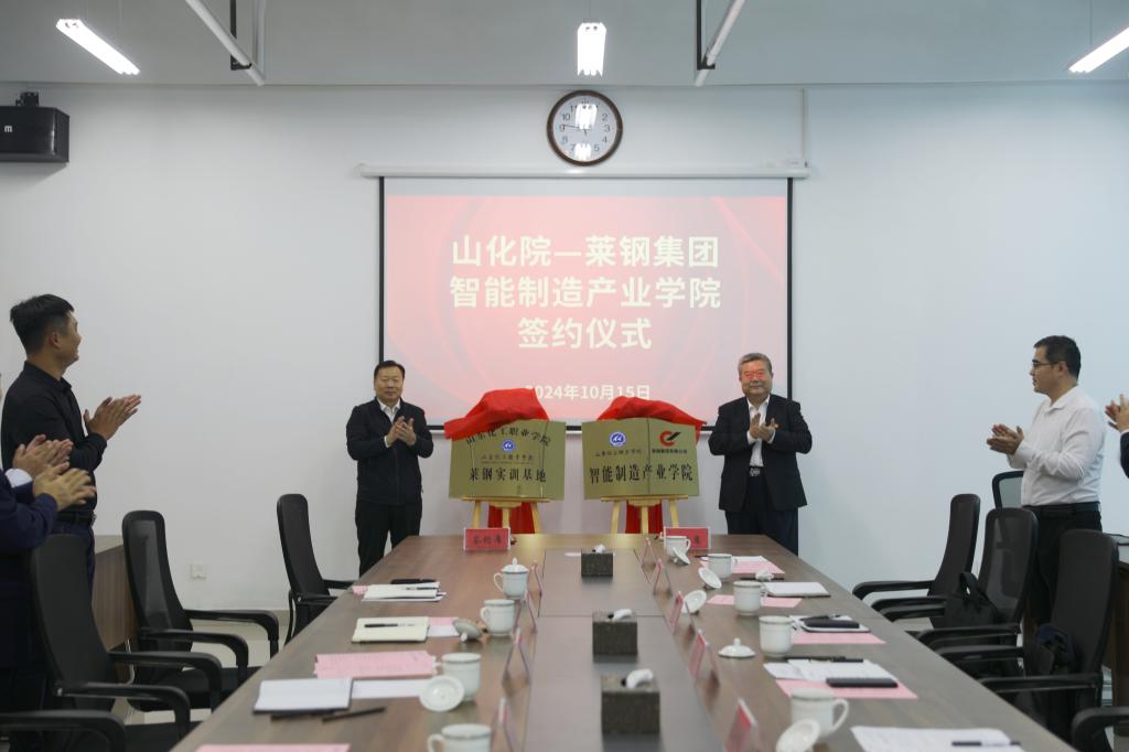 10月15日上午,山化院-莱钢集团智能制造产业学院签约揭牌仪式在我校圆满举行。莱钢集团党委副书记、董事、工会主席李茂岭,莱钢党校副校长、培训中心党委书记、主任鉴继祥,我校校长贺志强出席仪式。仪式由学校常务副校长冯喜成主持。