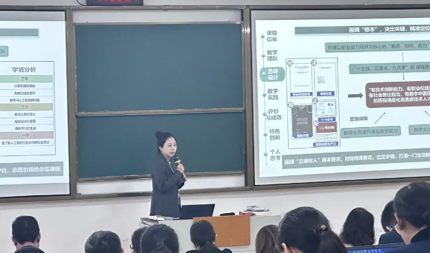活动中7名选手进行了精彩展示,校内外专家予以针对性点评,并给出了具有建设性意义的建议。现场专家充分肯定了教师选手们的讲说能力,一致认为课堂要重组织实施,提升学生参与度,多种教学方法有机融合;课程要明确课程定位,细化三维目标;专业建设要进行必要的企业调研,探索数智化赋能产业升级;专业群建设组群逻辑要清晰准确,思路清晰,实施路径切实可行。