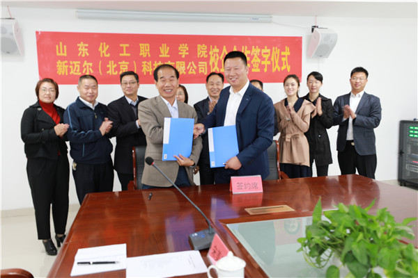 2017年10月17日,山东化工职业学院与新迈尔(北京)科技有限公司举行校企合作签约仪式。此举标志着山东化工职业学院在搬迁潍坊新校区后,在创新教育教学、深化校企合作方面迈出了崭新的一步,也以优异的办学成果向党的十九大胜利召开献上了一份厚礼。山东化工职业学院院长王敬良、常务副院长李欣,新迈尔(北京)科技有限公司总裁车云月、教学研发总监周贤等参加了签约仪式。