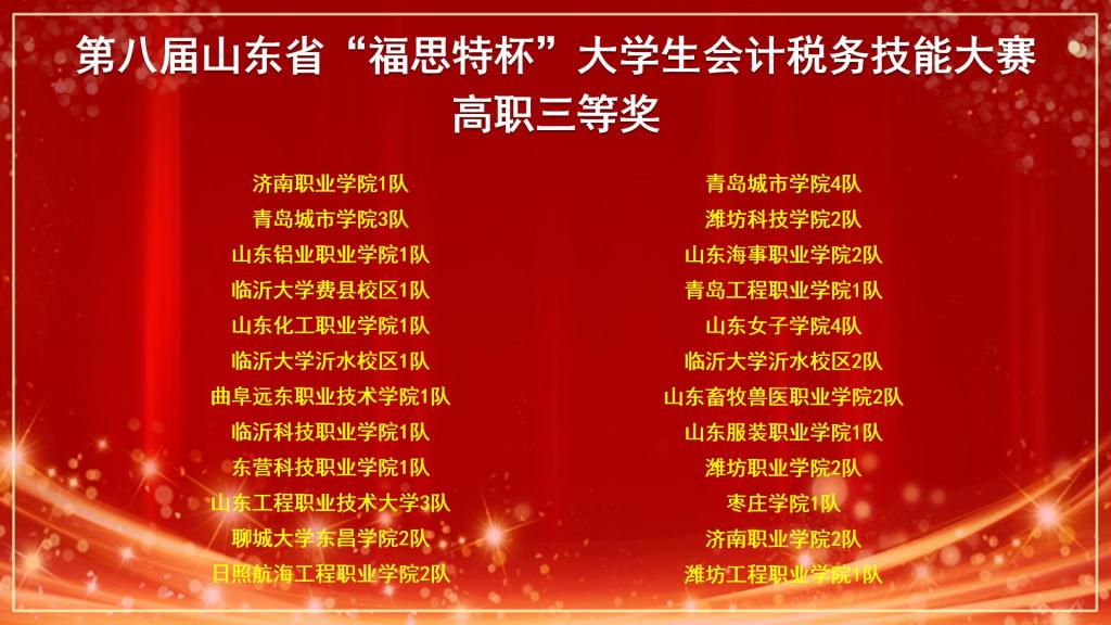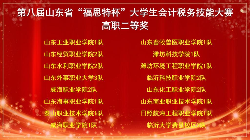 12月7日,山东省第八届“福思特”杯大学生会计税务技能大赛圆满落幕。我校学生闫书语、史芮嫣、张悦、燕博宇、郑佳璐、魏婷组成的代表队荣获高职组二等奖,学生张朋奇、张志硕、张晓珂、宫文杰、杨雯清、马永欣组成的代表队荣获高职组三等奖。