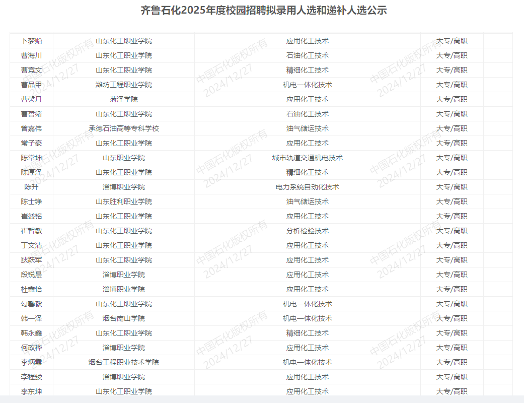 另外中石化催化剂齐鲁分公司招聘计划11人,我校8人成功考入,成绩斐然。上海石化、济南炼化、青岛炼化、南京化工、石家庄炼化、洛阳石化、胜利油田等企业也有多名学生被成功录用。