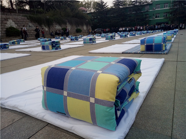 叠被子接力赛吸引了同学们踊跃参与和现场观摩,他们集聚在广场,为参赛的同学呐喊助威,品头论足。参赛的同学卯足了劲投入到叠被子这份细活之中,虽有几分紧张,更有多分认真,他们把叠被子当作一份作品,力求精益求精,一点一点地“精雕细刻”,直到满意为止。参赛的男同学丝毫不让“美眉”,一下子绽放出许许多多平常见不到的精细劲儿,叠出的被子甚至还要比女同学的被子好看很多。