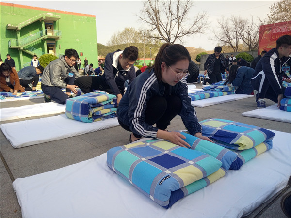4月12日,山东化工职业学院大学生叠被子接力赛在校园小广场举行,来自全校的125名同学组成25支代表队参加了比赛。他们5个人一组,每人负责叠一床被子,每组的第一名同学叠完之后,下一名才能动手叠,以此接力,直到第五名同学在25分钟之内叠完。25分钟之后,由同学们自己组成的裁判小组,根据每床被子叠成的“豆腐方块”程度进行现场考评打分,最终评出优胜队和30名优秀个人。