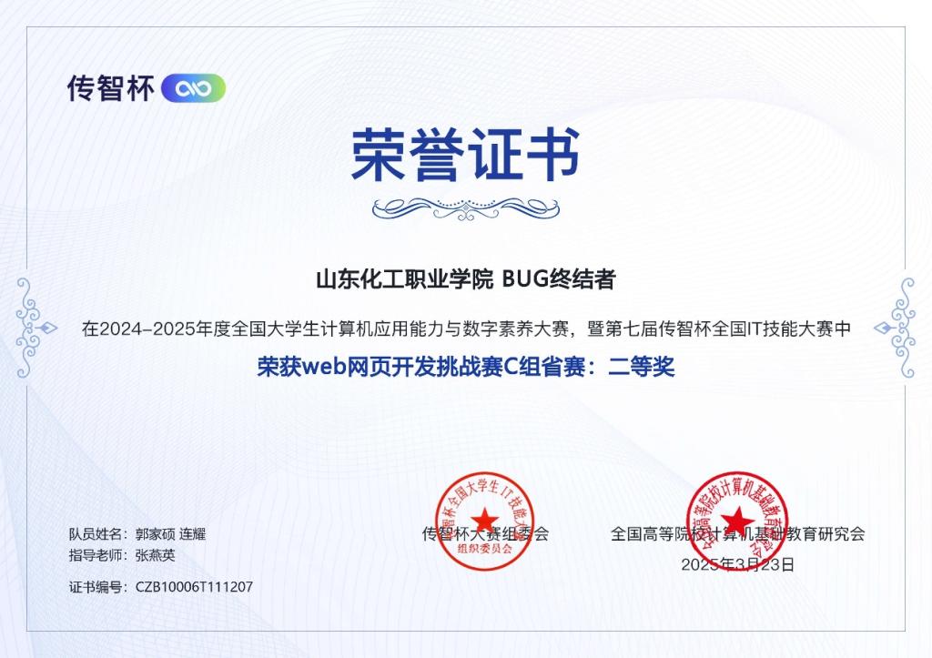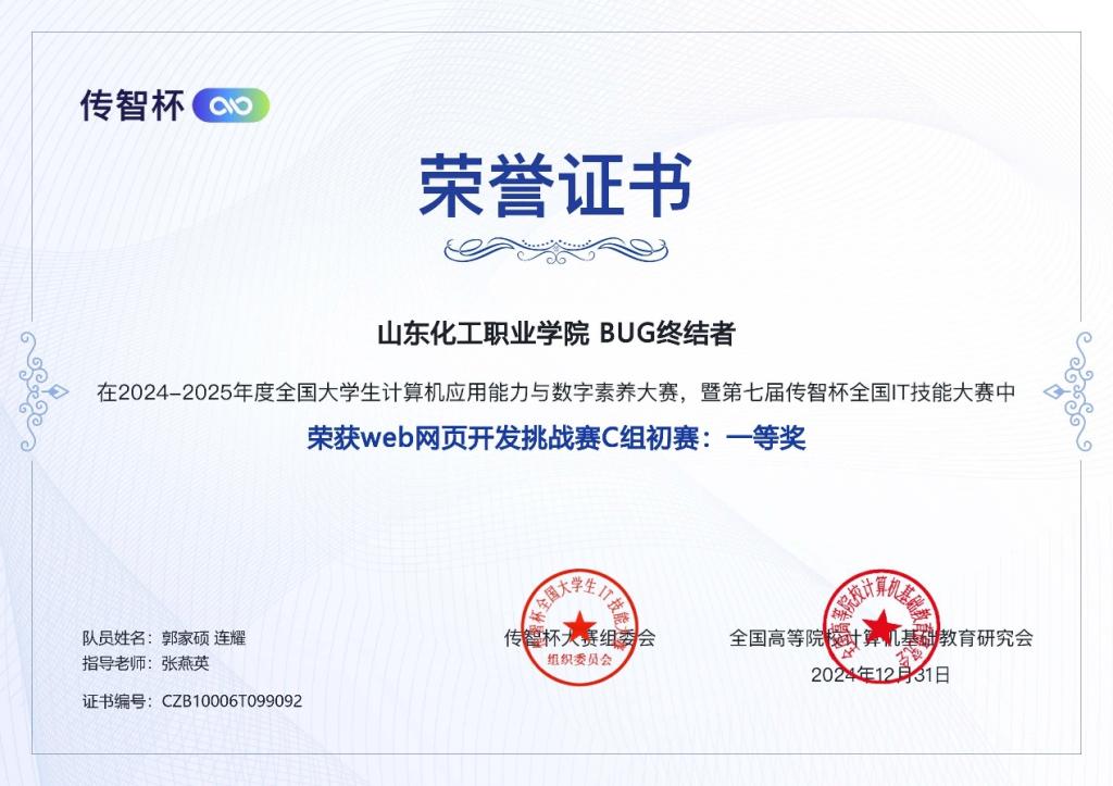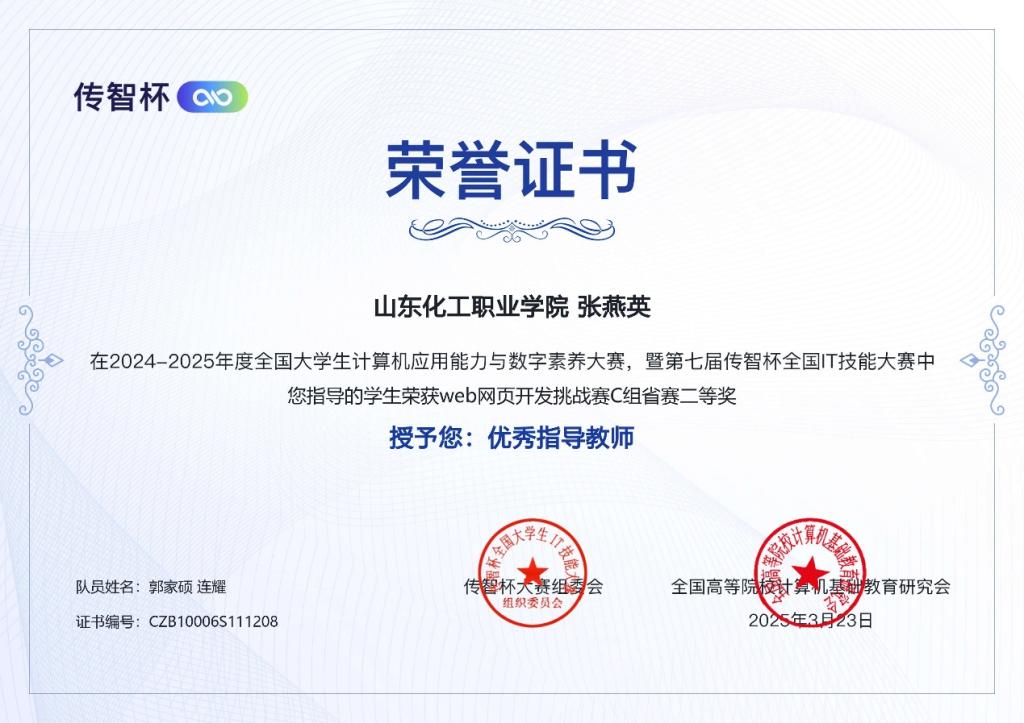 第七届传智杯全国IT技能大赛“未来创想,网启新篇”网页设计挑战赛省赛圆满结束。经过激烈角逐,我校学生连耀、郭家硕取得初赛一等奖和省赛二等奖的优异成绩,教师张燕英荣获“优秀指导教师”。
