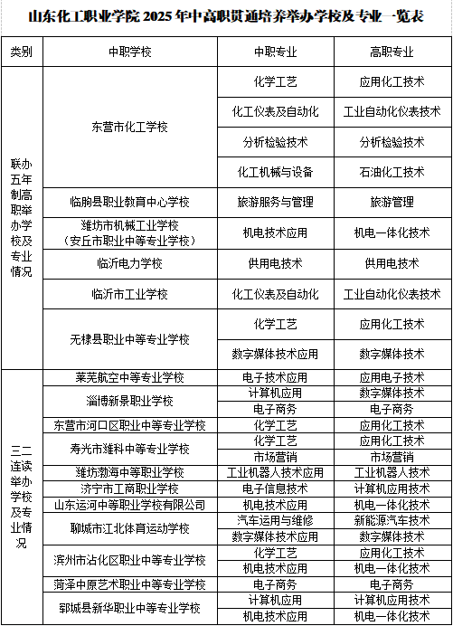 近日,山东省教育厅发布《关于公布2025年中高职贯通培养举办学校及专业备案结果的通知》(鲁教职处函〔2025〕4 号),我校与东营市化工学校、临朐县职业教育中心学校等17所中职学校联办五年制高职和三二连读办学26个专业成功获批,这一成果标志着我校在中高职一体化人才培养方面迈出了坚实步伐,进一步推动了学校高质量发展。