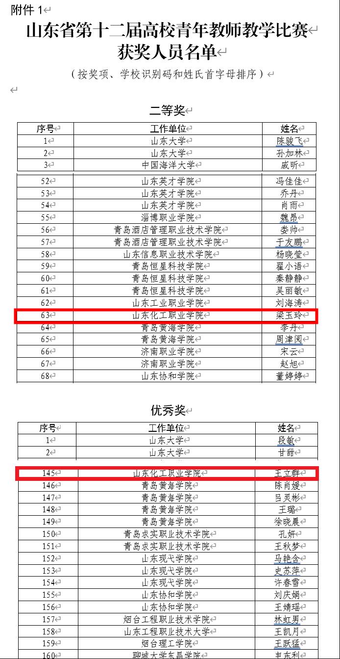 近日,山东省教育厅公布了《关于山东省第十二届高校青年教师教学比赛获奖人员名单和优秀组织奖获奖单位的公示》,我校教师梁玉玲在本次比赛中荣获二等奖、王立群荣获优秀奖。