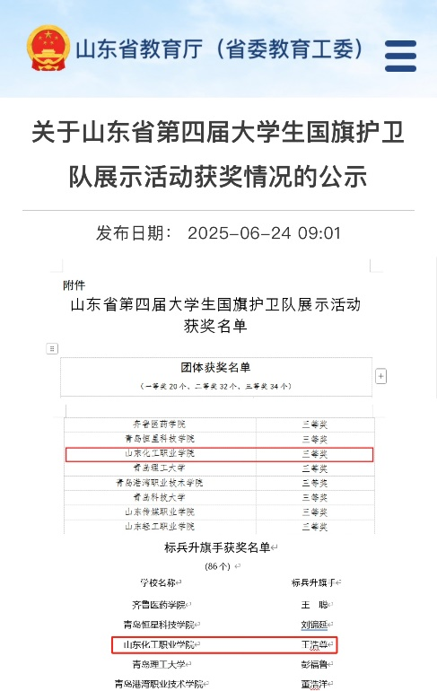 近日,由山东省教育厅、中共山东省委宣传部、山东省国防动员办公室、山东省军区政治工作局联合主办的2025年山东省大学生国旗护卫队展示活动圆满落幕。我校国旗护卫队荣获团体三等奖,学生王浩尊获评“标兵升旗手”称号。
