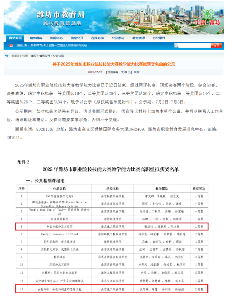近日,潍坊市教育局对2025年潍坊市职业院校技能大赛教学能力比赛拟获奖名单进行公示。经过专家评选,我校共8个团队获奖,其中高职组一等奖团队1个、二等奖团队2个、三等奖团队4个,中职组三等奖团队1个。